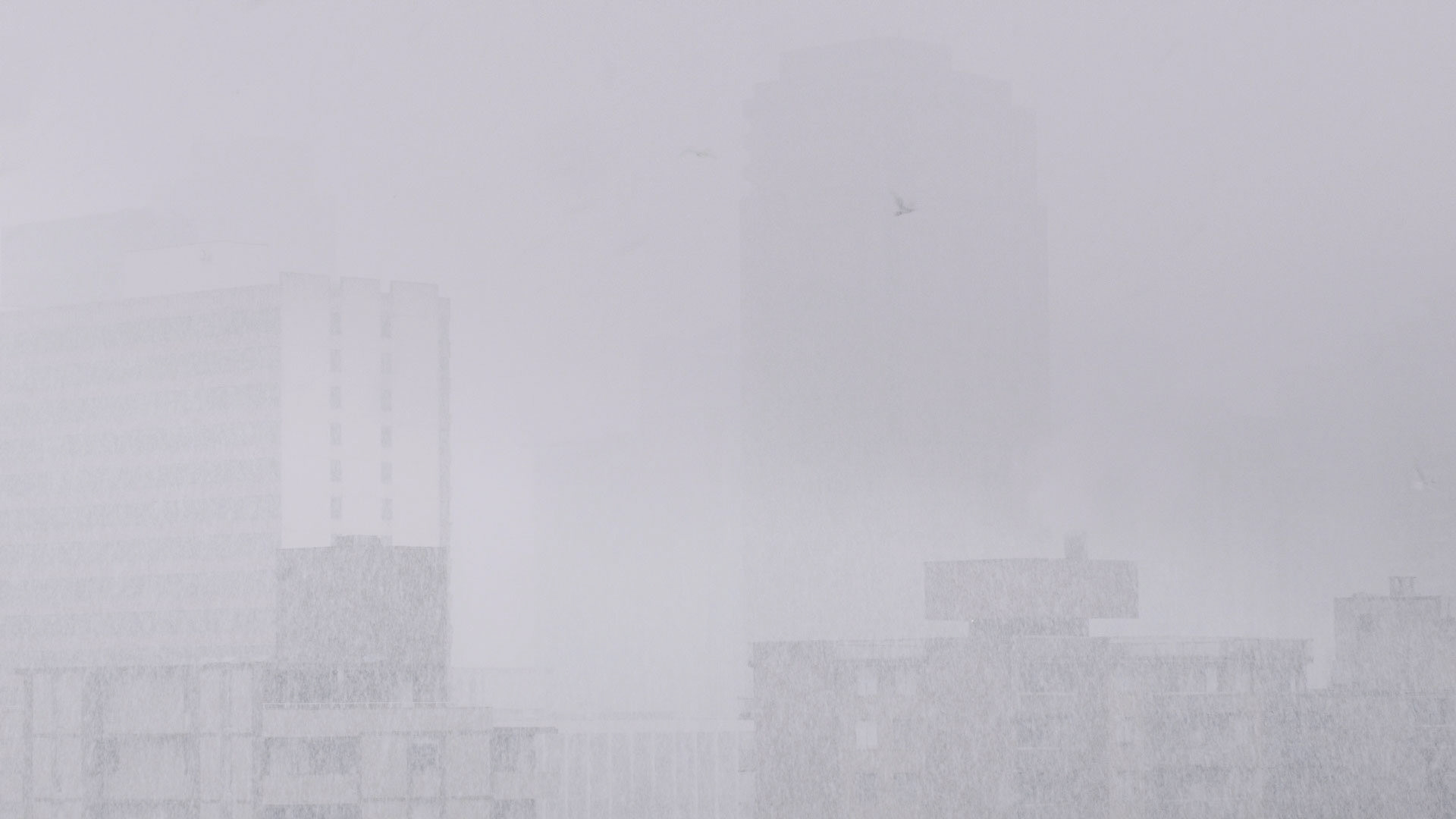 Seagulls are struggling to fly through a snowstorm in the city. Most of them seem inexperienced flying through a snowfall, so they submit to where the wind takes them.